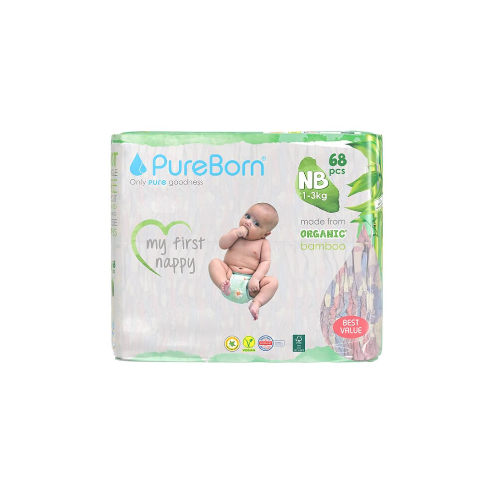 PureBorn Eco Organic Bamboo Nappies, Size Newborn (up to 5 kg), 68 Nappies,