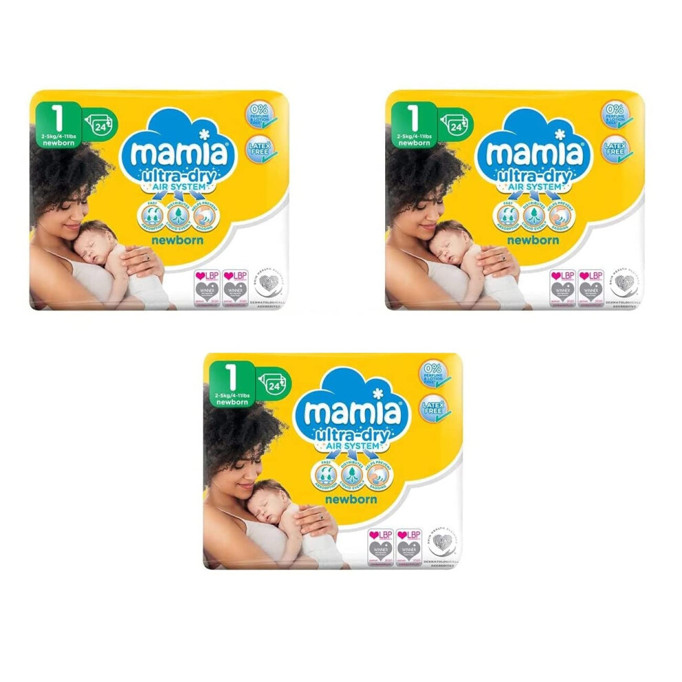 (Pack of 3) Mamia Baby Newborn Nappies, Size 1, 2-5kg, 3 x 24 (72 Nappies)