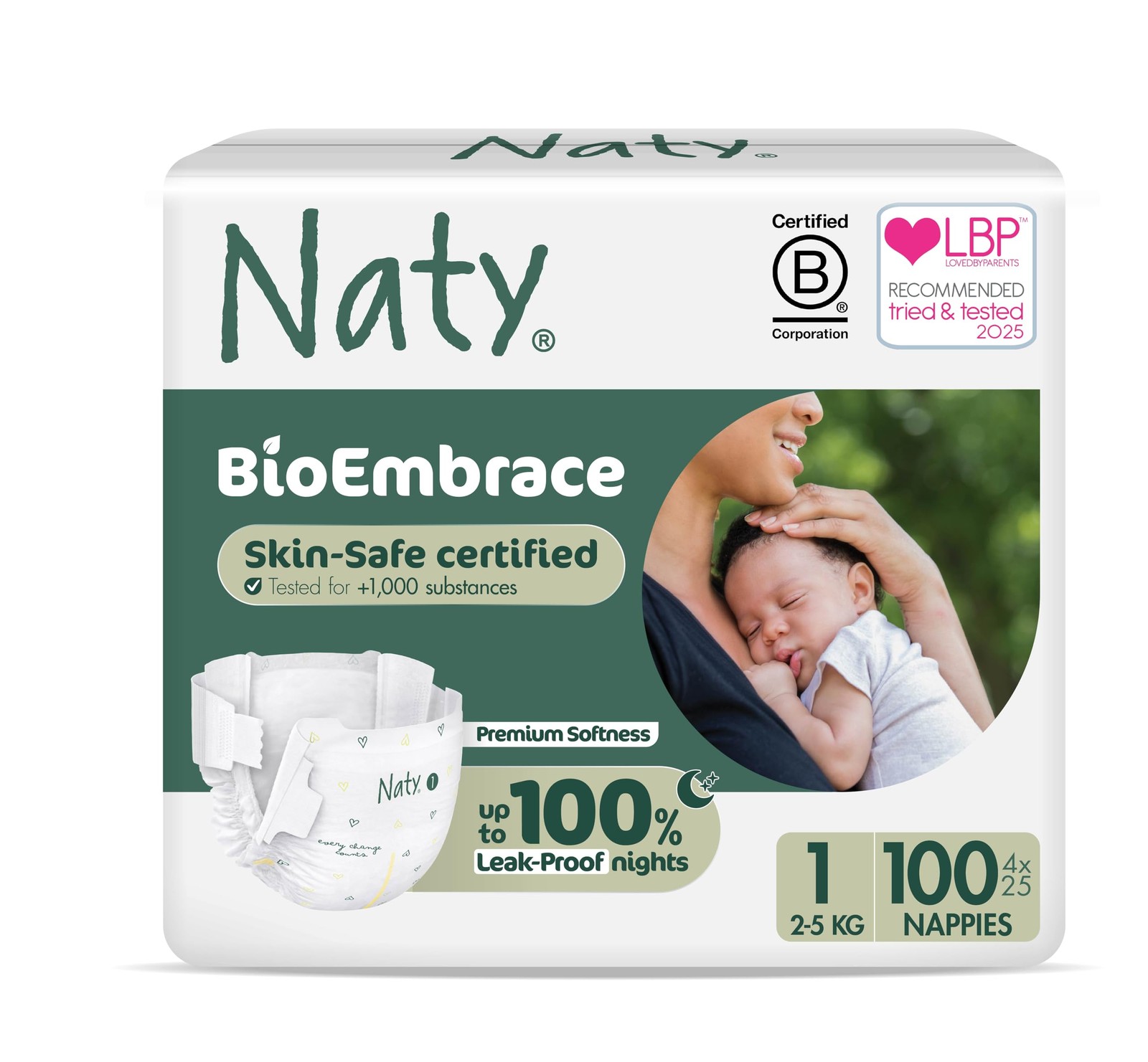 Naty BioEmbrace Baby Newborn Nappies | Sensitive Skin Safe Certified | Leak Protection up to 100% | Plant-Based Teddy Softness, Premium Comfort | Chlorine-Free | Size 1 (2–5kg), 100 Count