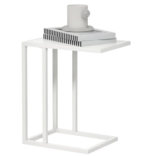 HOMCOM C Shape End Table w/Metal Frame Sofa Side Table Narrow Snack Coffee Table for Living Room, White Wood Effect