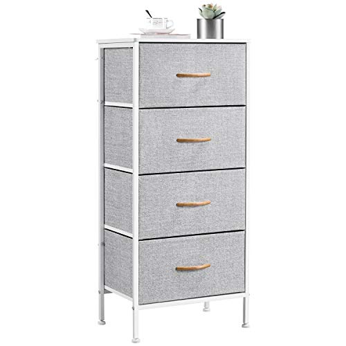Taotigzu Dresser with 4 Drawers,Fabric Chest of Drawers with Large Storage Space,Narrow Storage Drawers Tower for Living Room,Bedroom,Wooden Top and Metal Frame,28x43x77CM (White)