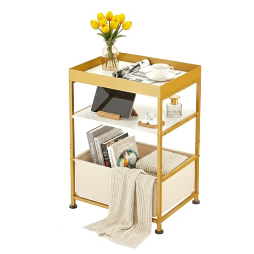 ZEXVIDA Gold & White Bedside Table with Fabric Drawer, Modern 3 Tier Narrow Side Table with Tray Top & Storage Shelf, Slim Glam Nightstand for Bedroom, Nursery, Dressing Room, Uni Halls, Metal Frame