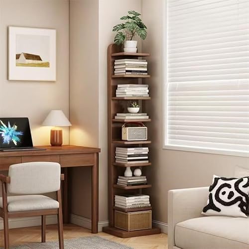 modern style wooden corner bookshelf, 5-tier tall narrow open shelving unit, wall-mounted floating storage rack with anti-tipping device, suitable for small spaces, (Dark brown, 9 layers)