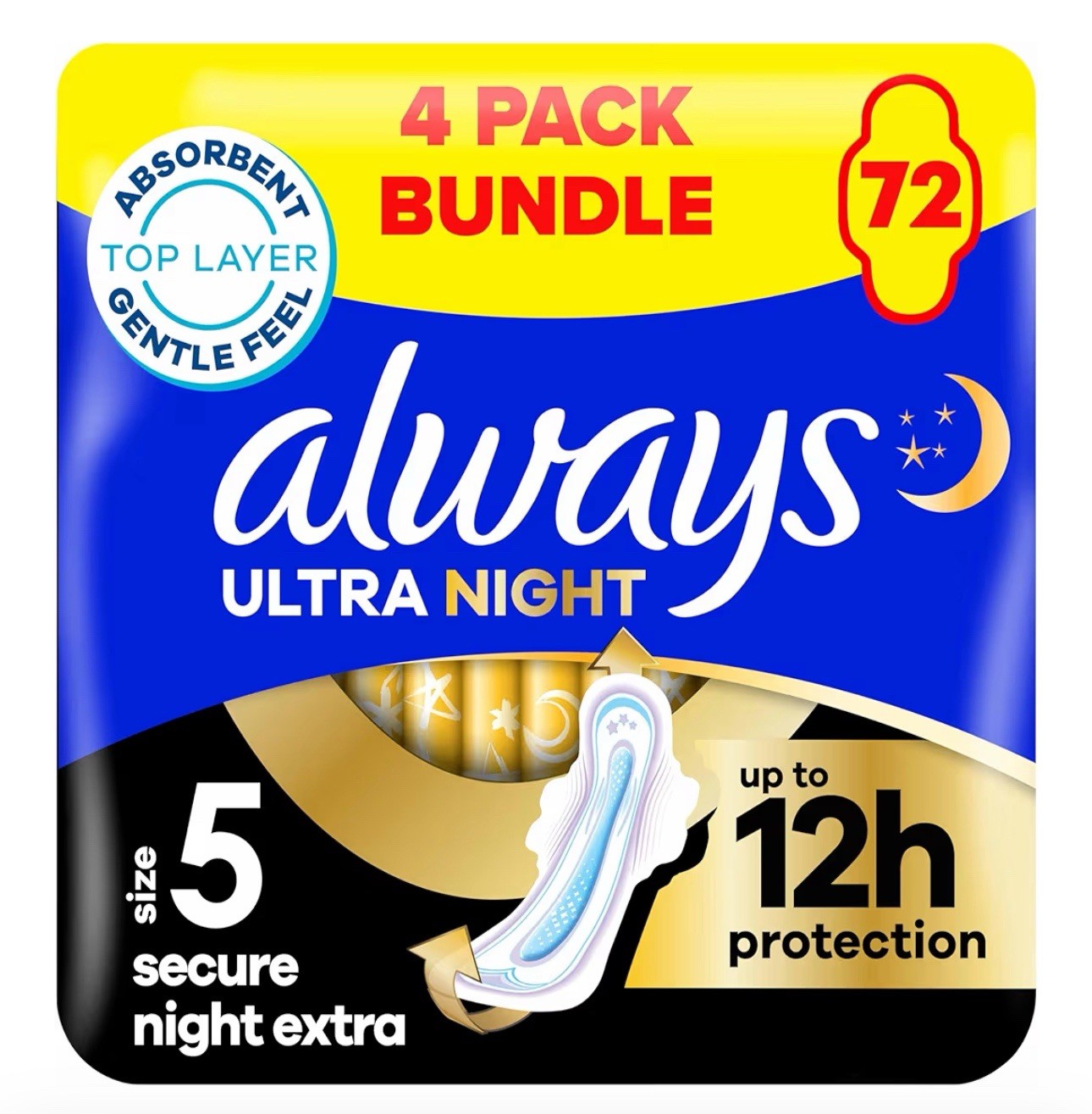 Always Ultra Sanitary Towels/Pads with Wings, Secure Night Extra Size 5, Thin, 72 Towels (18 x 4 Packs)