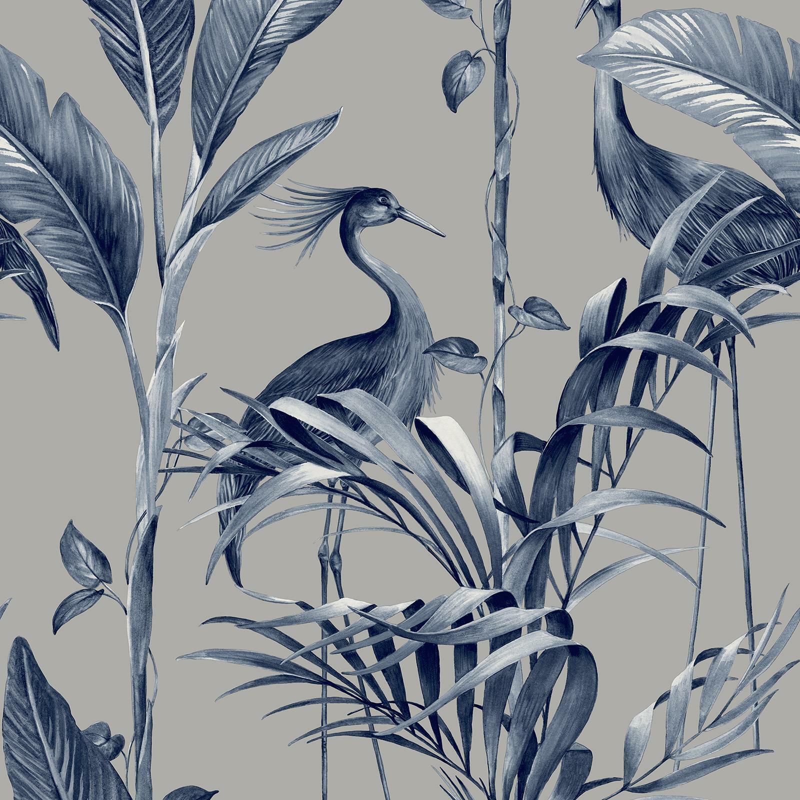 Belgravia Azzura Leaf Navy Blue Metallic Silver Tropical Birds Leaf Wallpaper