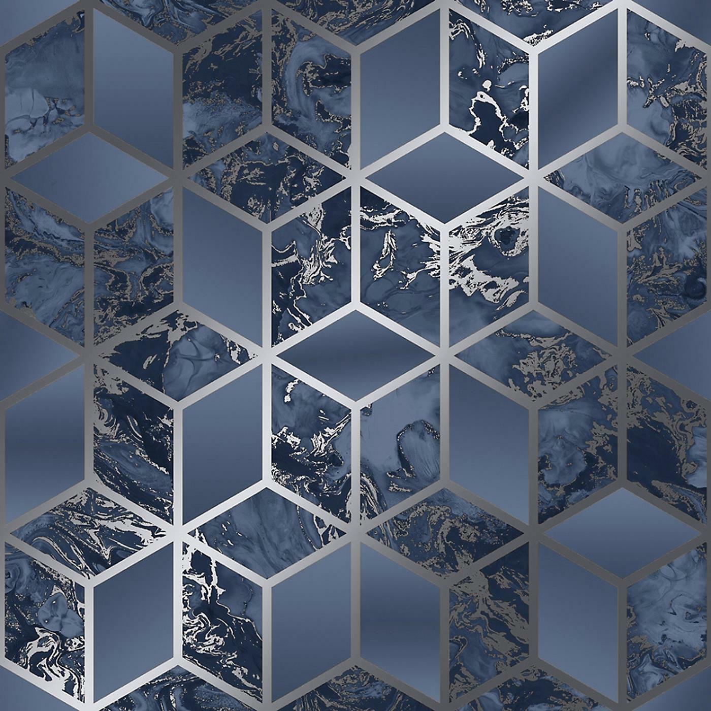 Muriva Geometric Cube Liquid Marble Navy Silver Wallpaper Elixir Metallic Modern