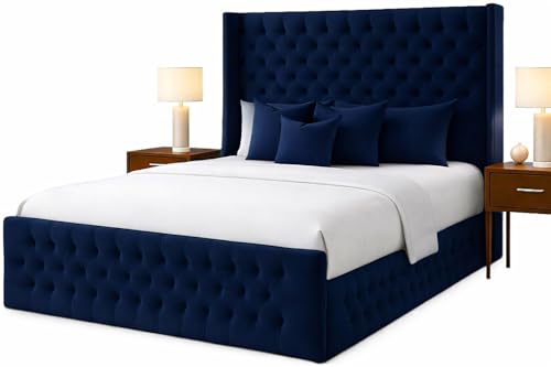 Attock Beds Plush Velvet Wing Panel Bed Frame with Optional Mattress & Ottoman Gas Lift Storage – Luxury Handmade Bed (Navy Blue Plush, Double 4ft6 with Gas Lift)