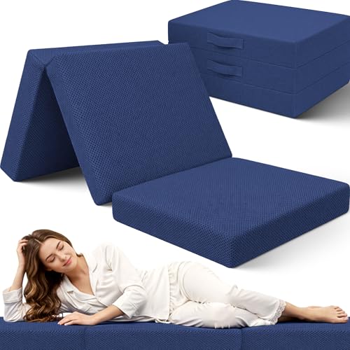 SAPPHIRE Tri-Fold Folding Mattress Single, 12cm High Density Foam Floor & Guest Bed, Portable Foldable Futon Mattress with Washable Cover, Travel & Camping Z Bed (Navy Blue)