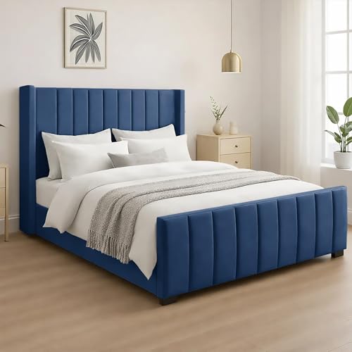 4FT6 Elegant Navy Plush Double Bed Frame | Stylish Vertical Lined Floor Standing Wingback Headboard & Footboard | Without Mattress | Luxury Bed Frame for You