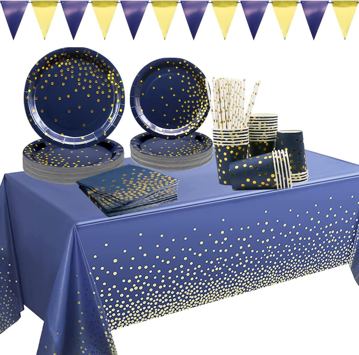 Navy Blue and Gold Party Decorations Tableware Set - Plates, Cups, Napkins, Banner, Tablecloth, Straws - for Wedding Birthday Party Anniversary Baby Shower Serves 25 Guests (A)