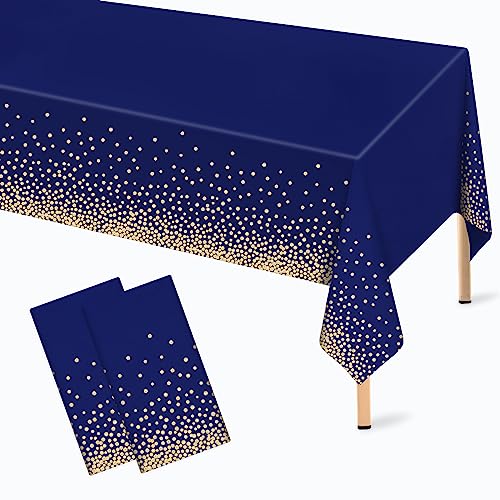 2 Pcs Navy Blue and Gold Plastic Tablecloth for Rectangle Table, 54 × 108 inches Disposable Gold Dot Dark Blue Party Table Covers for Anniversary, Wedding, Fine Dining, Graduation Party Decoration