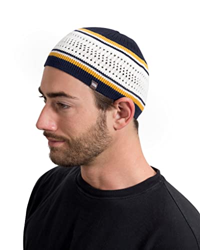 Breathable Cotton Stretchy Skull Cap Kufi Hats for Men in Cool Designs | Helmet Liner | Muslim Ramadan Gifts Eid Gifts, Navy Blue and White with Gold Stripes, One Size