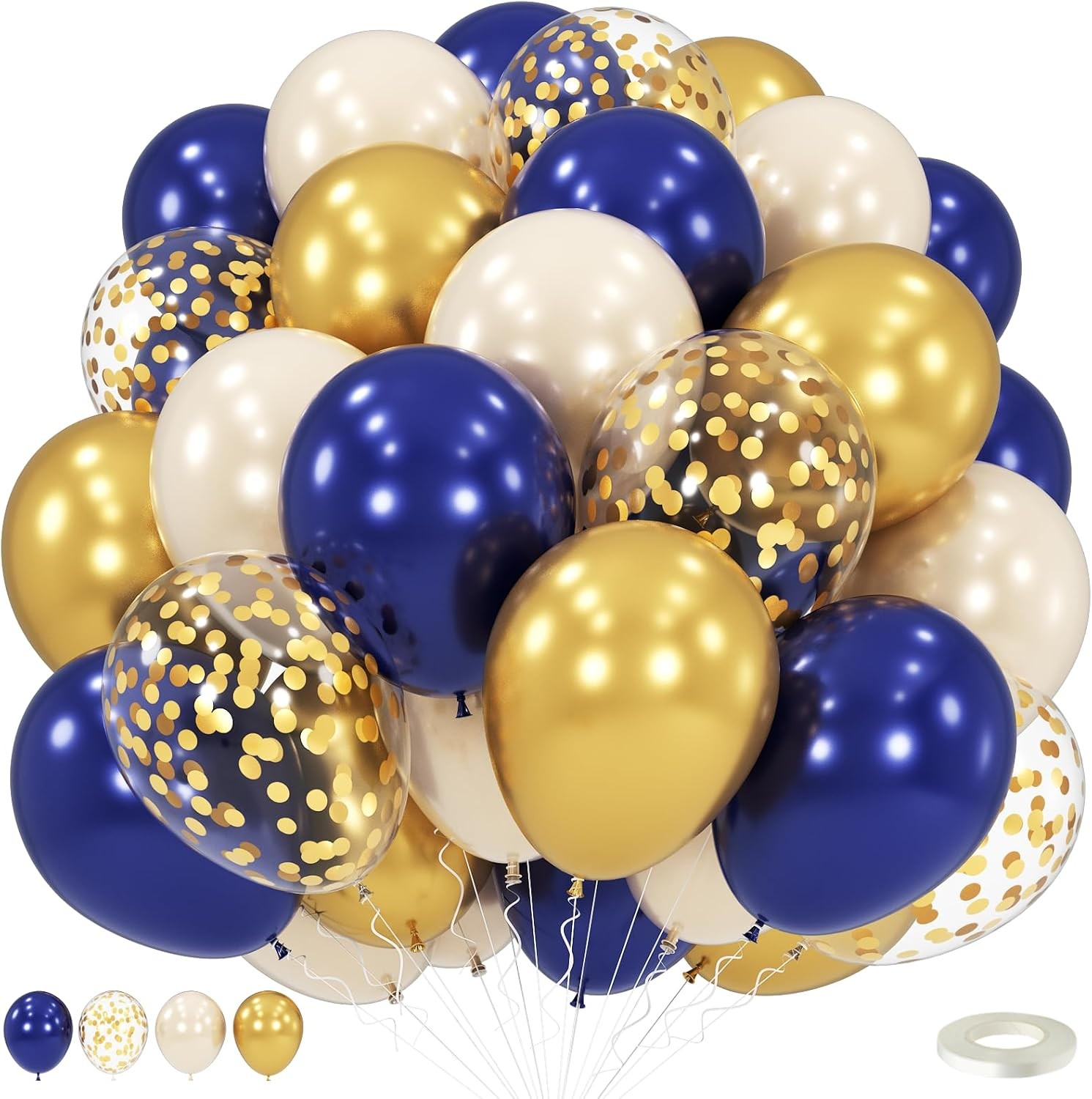 Navy Blue, Confetti & Metallic Gold Balloons - Pack of 30 Latex 12" Inch With 1pc Ribbon for Birthday Parties, Weddings, Anniversaries and Celebrations