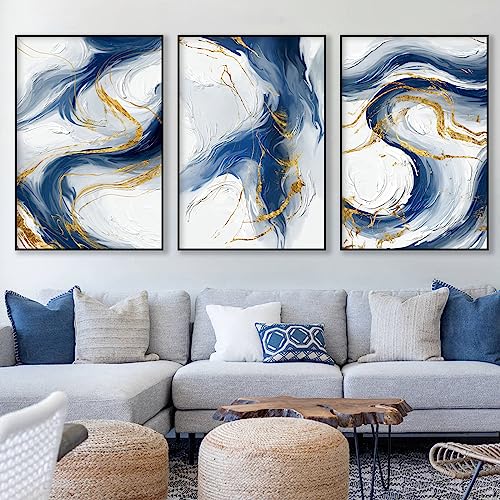 Gold Abstract Modern Wall Art - Blue and White Canvas Painting With Gold Foil - Navy Marble Artwork for Living Room - 16x24in x3 No Frame