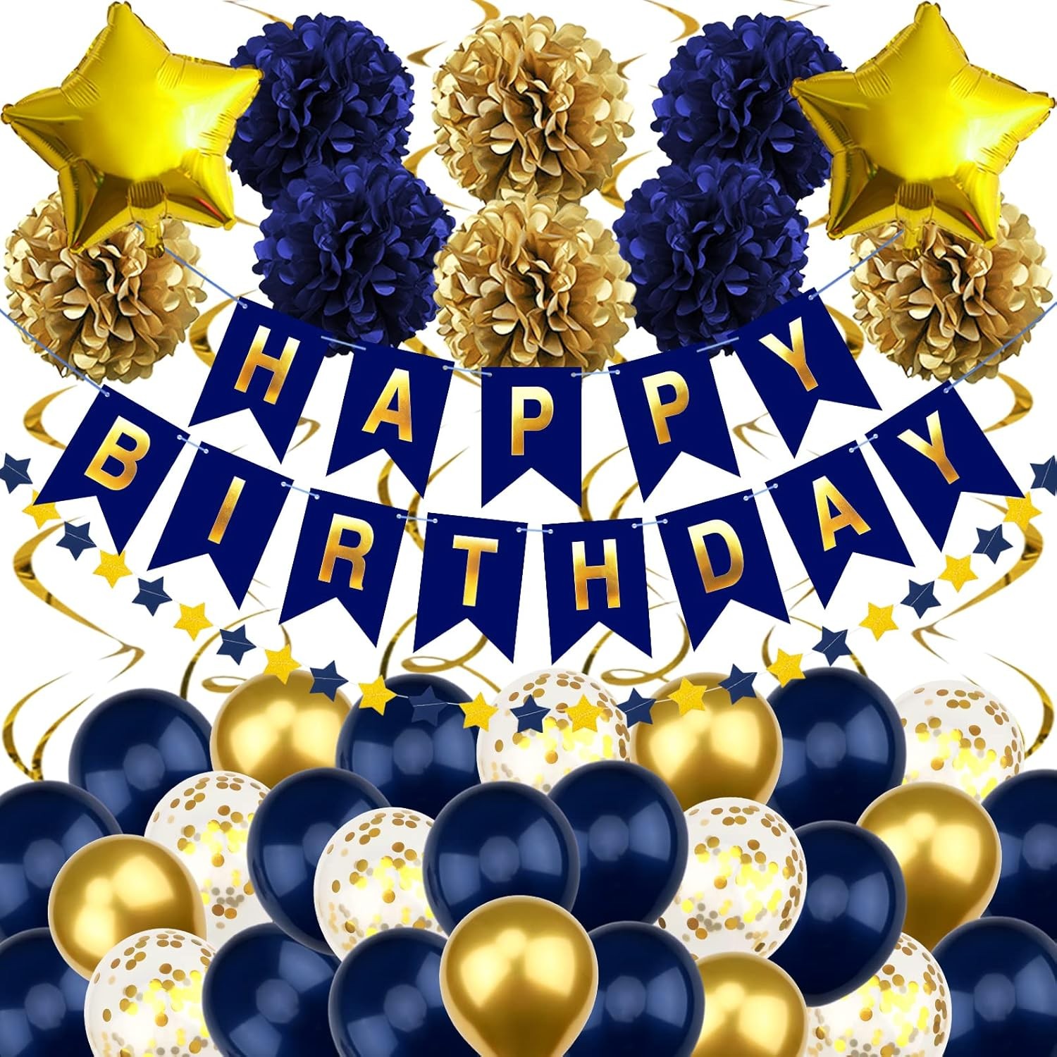 Navy Blue Gold Birthday Decorations, Happy Birthday Banner and Gold Star Balloons, Glitter Hanging Stars with Hanging Swirls, Bunting Banner, for Women Men Boys Party Decoration