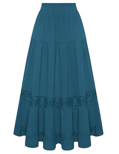 BEAUTELICATE Women's Maxi Tiered Skirt Long Swing Boho Vacation Summer Spring Fall Skirt Pure Cotton Retro Full Circle Victorian Renaissance Steampunk Period Costume(Navy Blue, L)