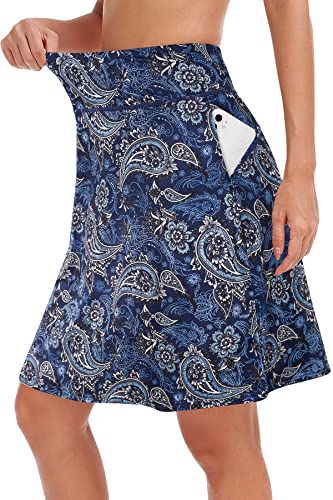 KORALHY 20" Knee Length Skorts Skirts for Women, High Waisted Tennis Athletic Skirt with Zipper Pocket, Navy Blue Flower, M