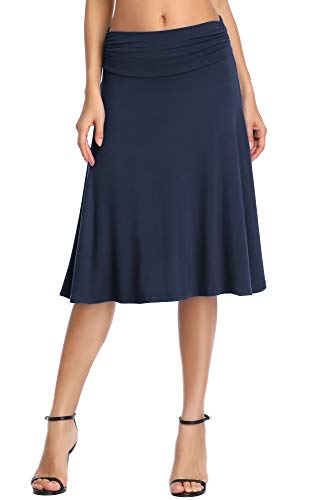 Urban CoCo Women's Ruched High Waist Knee Length Jersey A-Line Stretchy Flared Casual Skirt, Navy Blue, S