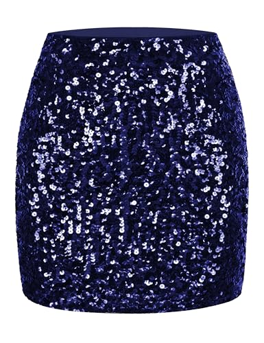 MANER Women's Sequin Skirt Sparkle Stretchy Bodycon Mini Skirts Night Out Party, Navy Blue, Large