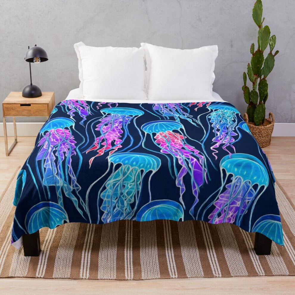 Fleece Throw Blanket Luminescent Rainbow Jellyfish on Navy Blue for Sofa Couch Kids 60 x 50 Inches