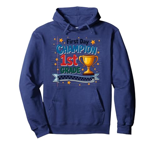 First Day Champion 1st Grade Star Student Trophy Pullover Hoodie, Adult Unisex, Navy, S