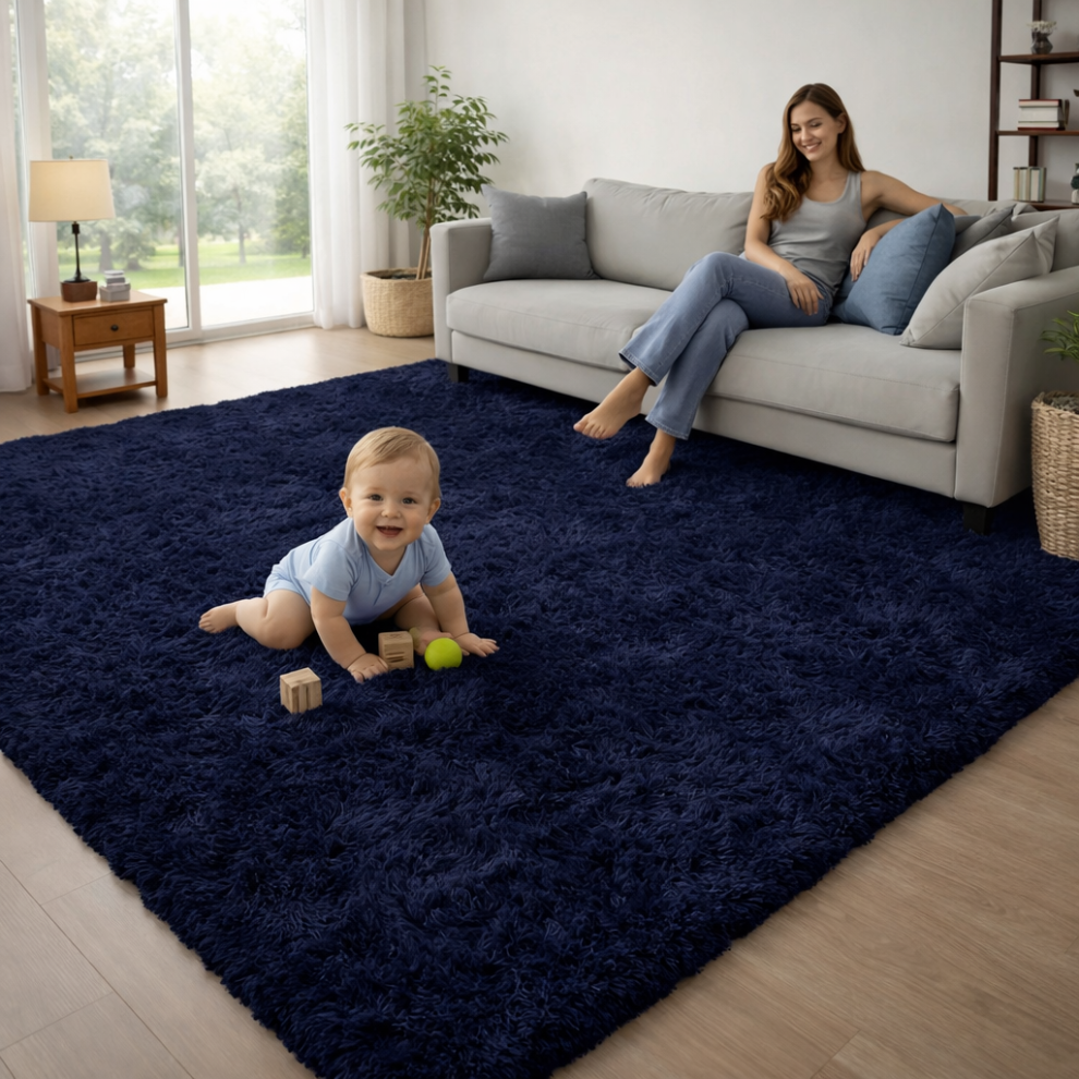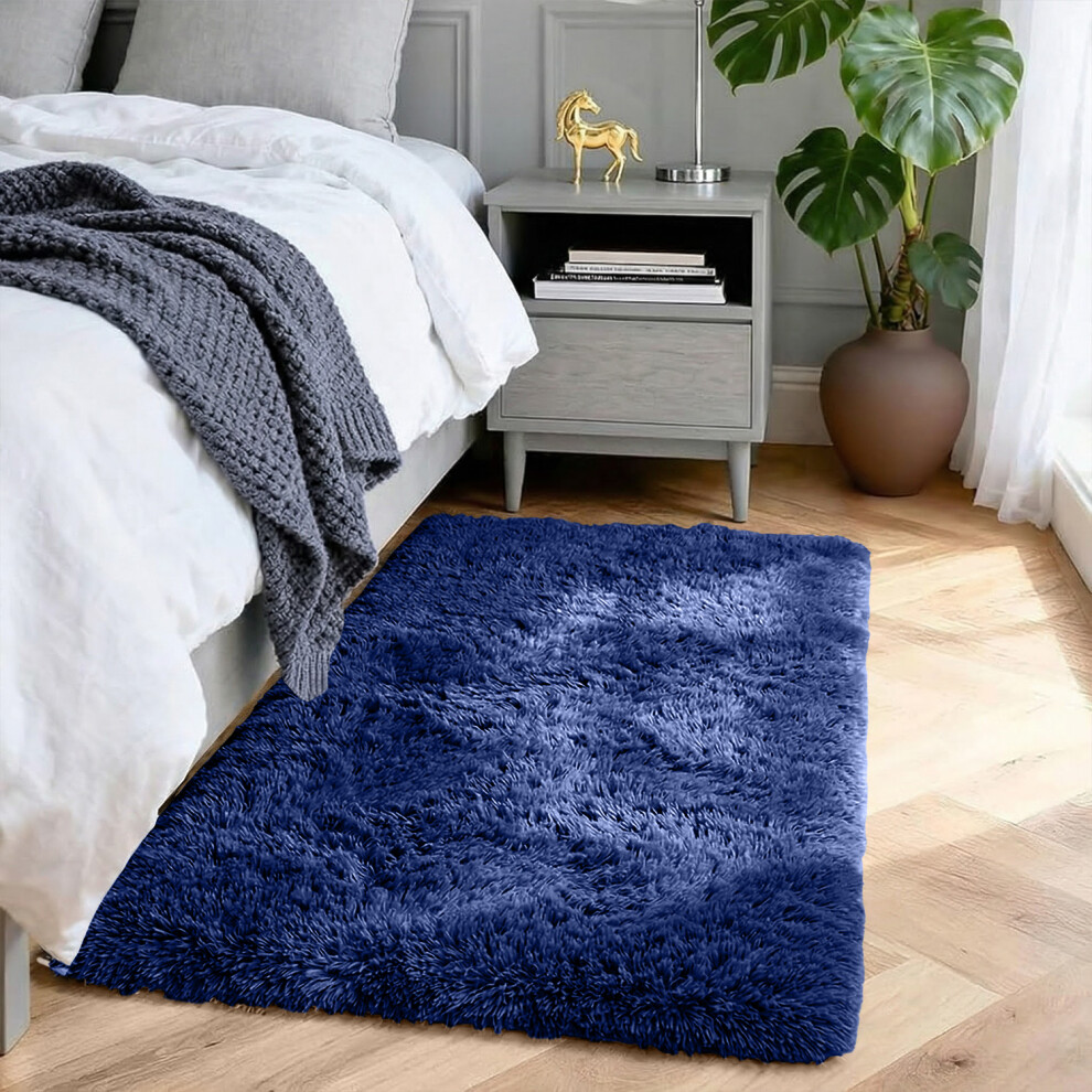 Super Soft Shaggy Living Room Navy Area Rugs Luxury High Pile Fluffy Modern Durable Thick Bedroom Rug Plush Carpet Shag Nursery Mat Comfort Hallway Rugs 120cm x 170cm