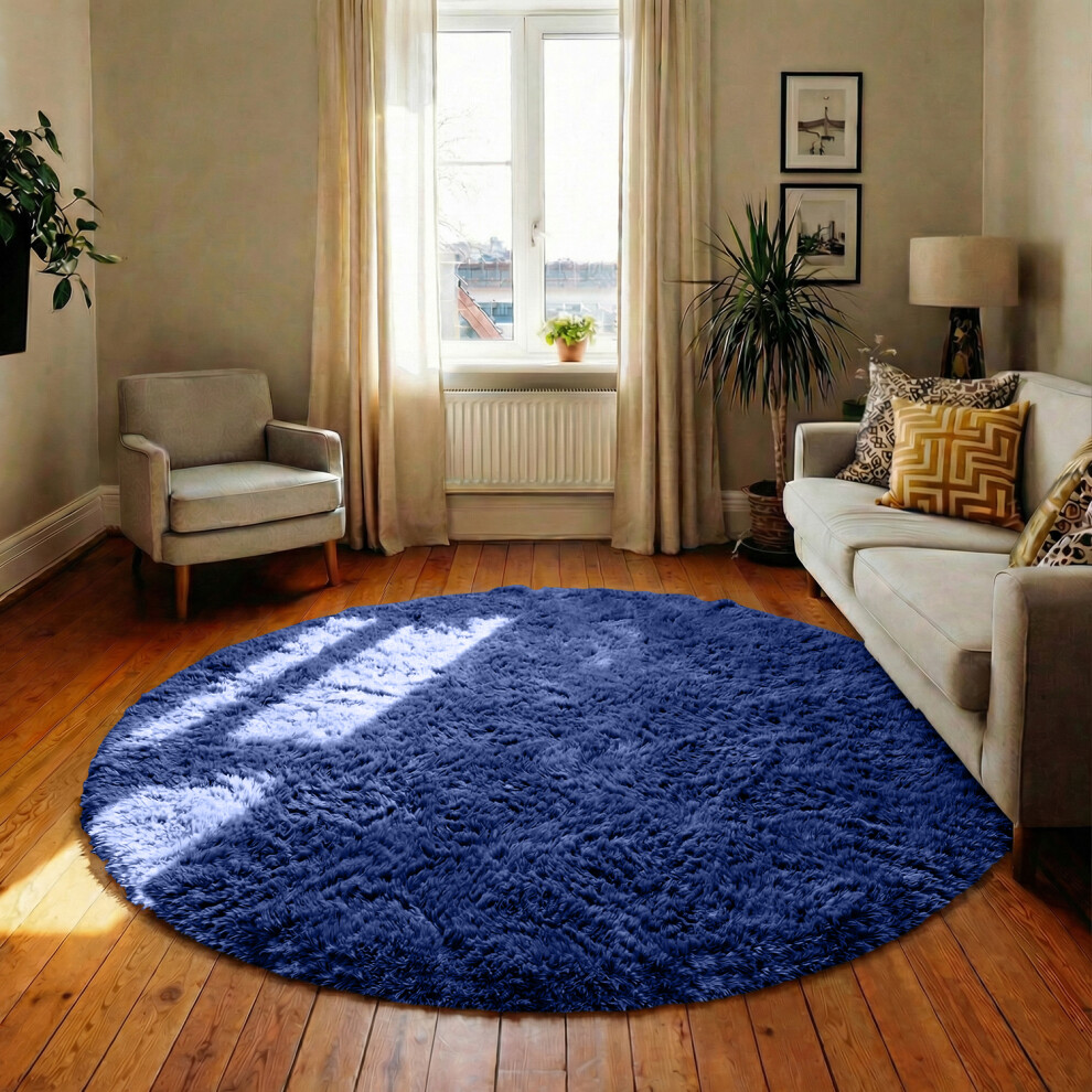 Serdim Rugs Plain Living Room Shaggy Area Rugs, Navy, Round 120x120cm(4x4')