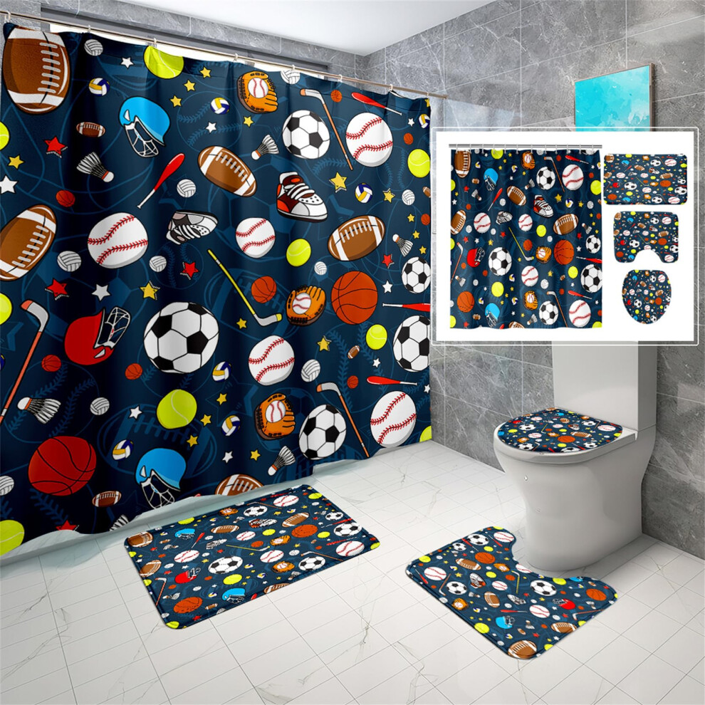 Sports Shower Curtain Set for Kids Basketball Theme Navy Blue with Rugs Bath Mat and 12 Hooks