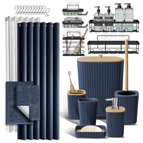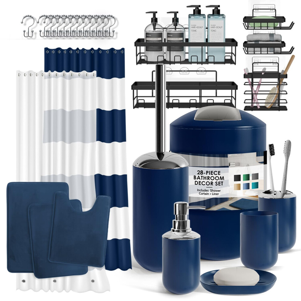 Shower Caddy and Bathroom Accessories Set with Bath Rugs, 27PC Bathroom Accessory Set with Shower Caddies Navy Bath Rugs, Shower Curtain Set, Toilet Brush, Trash Can, Soap Dispenser, Toothbrush holder