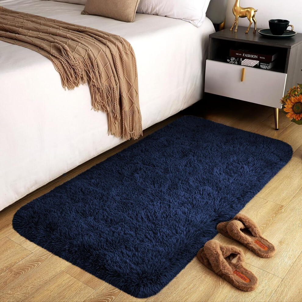 FALARK Soft Navy Blue Runner Rugs for Bedroom, 2x4 ft Bedside Rug Plush Fluffy Carpets, Shag Furry Modern Area Rug Carpet for Living Room Girls Kids Room Nursery Home Decor, Navy Blue