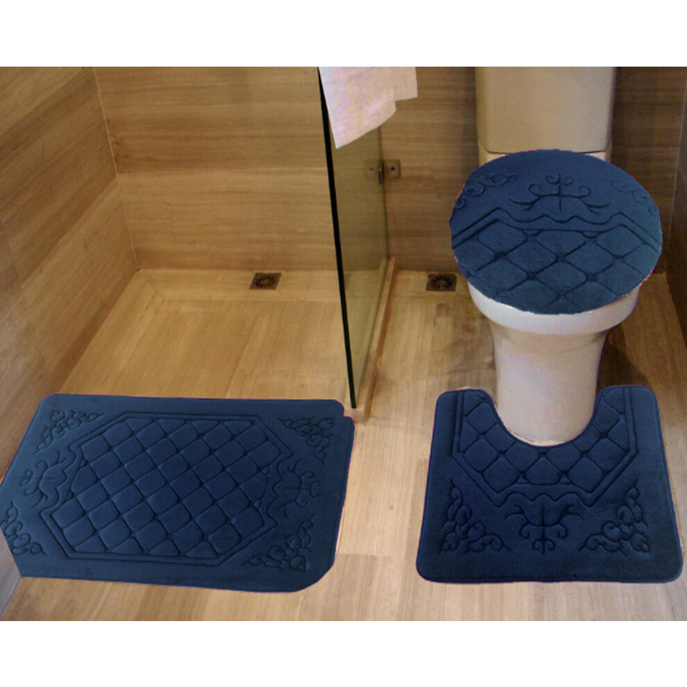 All American Collection 3PC Memory Foam Bath Mats Soft Plush Crown Design Anti-Slip Shower Bathroom Contour Toilet Lid Cover Rugs (Navy)