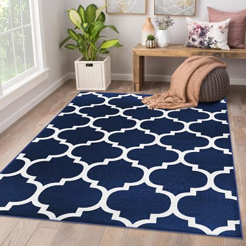 AMEHA Rugs Living Room 120 x 170 cm - Large Navy Blue Area Rugs for Bedroom Non Slip - Modern Carpet Non Shedding Trellis Style Durable Soft Low Pile Bedside Rug for Kids Room Easy Clean (Ava Navy)