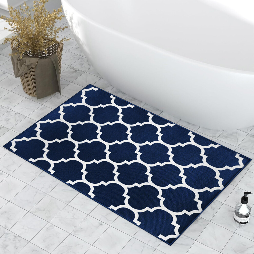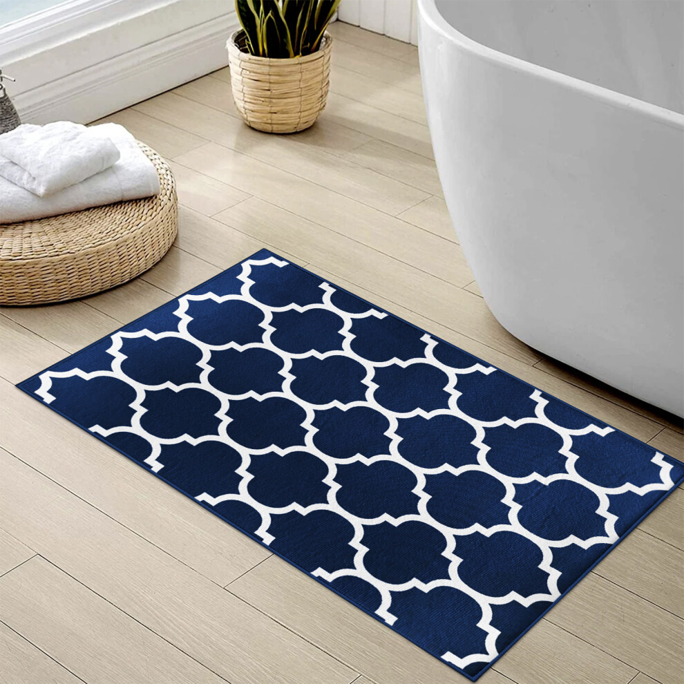 Soft and Plush Microfiber Bath Mat, Navy Bathroom Rugs with Non-Slip TPR Backing, Quick Dry Shaggy, Machine Washable, Stylish Geometric Design, Decora