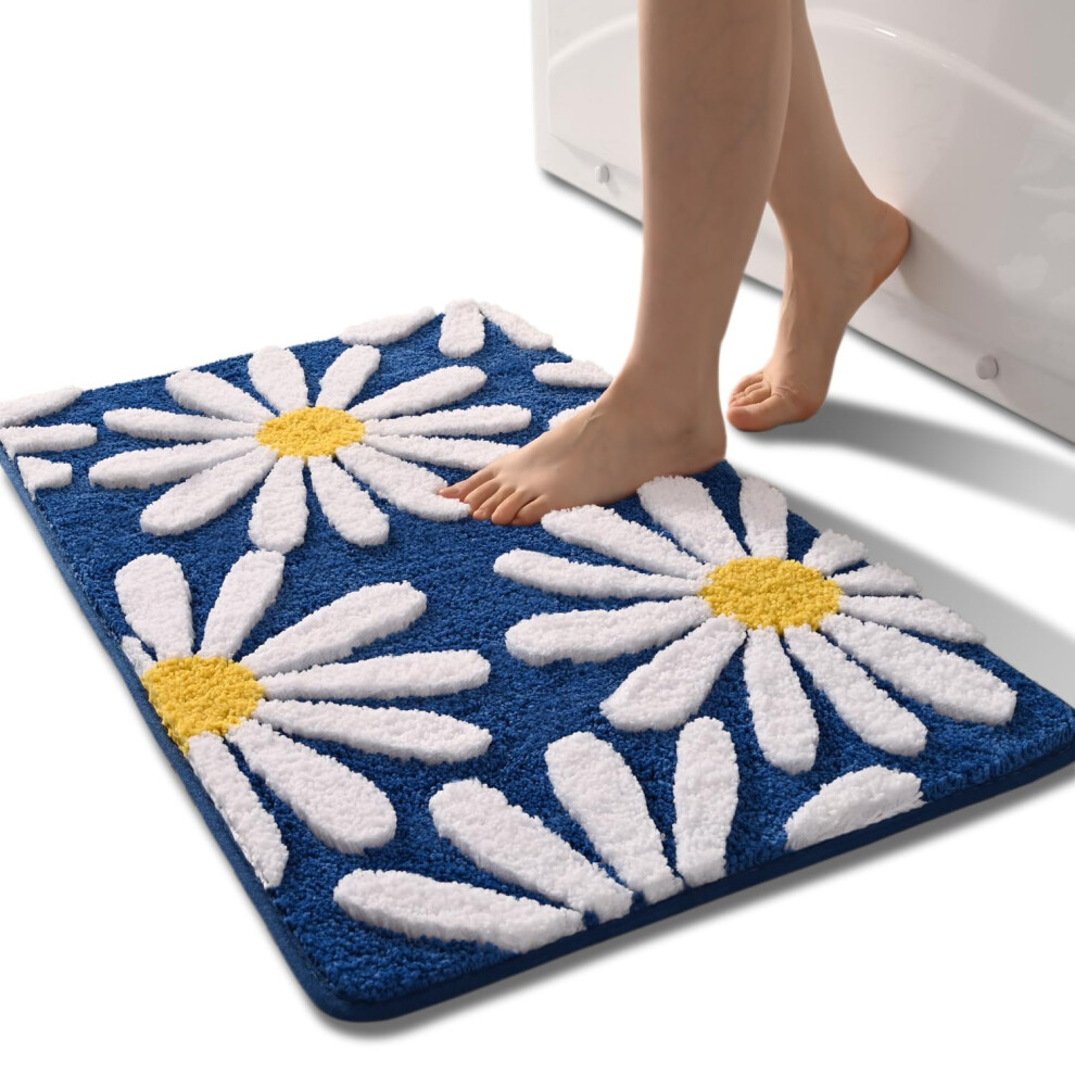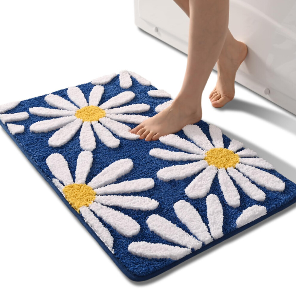Navy Blue Bathroom Rugs Cute Daisy Bath Mat White and Yellow Flower Decor Rug Non Slip Floor Carpet Microfiber Bathmat Super Absorbent Machine Washabl