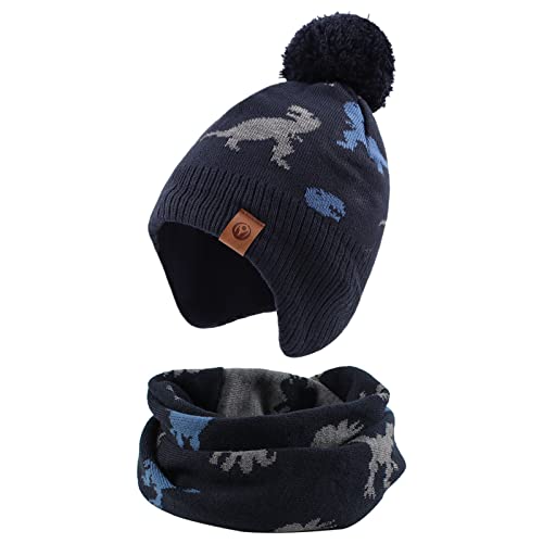 XIAOHAWANG Knitted Baby Hat Winter Warm Boys Girls Beanie Fleece Lining Toddler Kids Hat with Pompom (Navy Dinosaur Hat+Scarf, M)