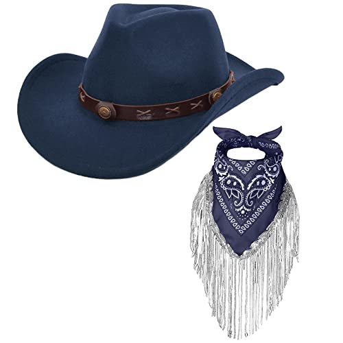 Erogeen Cowboy Hat with Fringed Bandana Set for Women Wide Brim Western Cowgirl Hat Paisley Head Wrap Scarf (Navy)