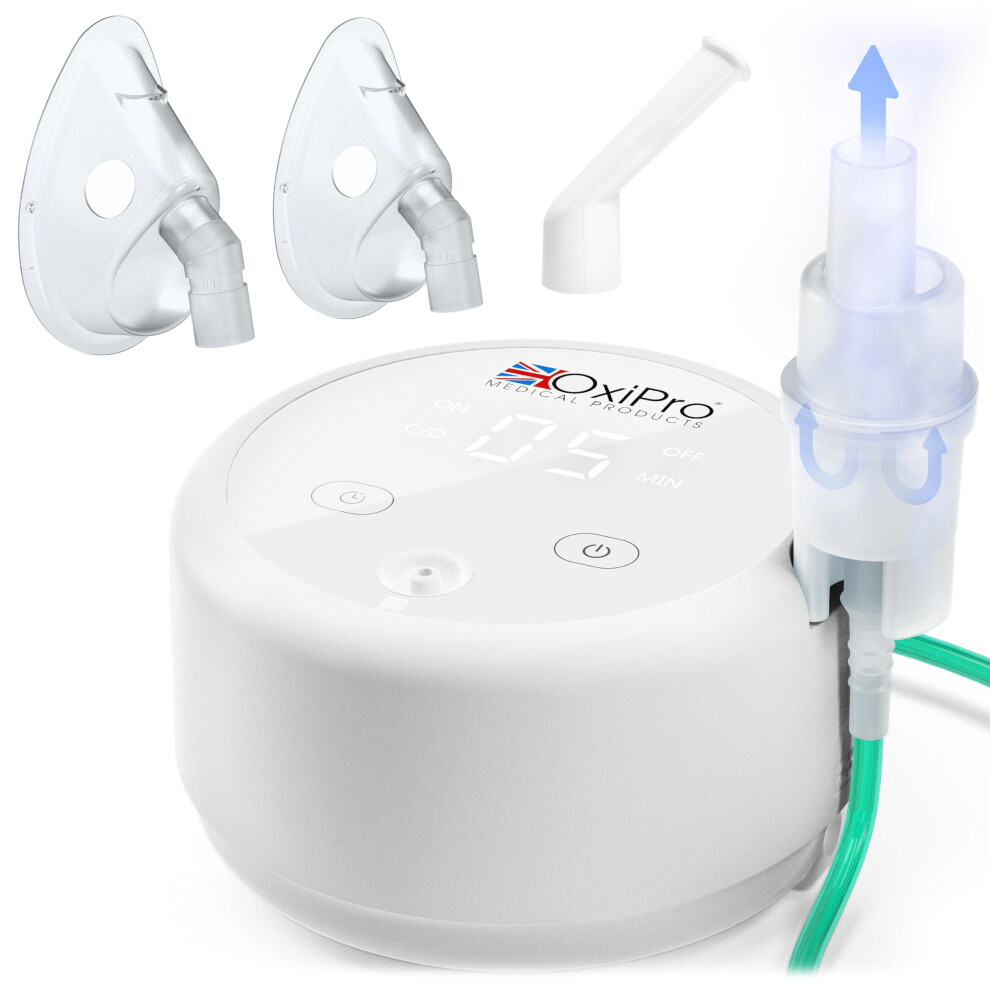 OxiPro NB20 Nebuliser - Health & Pharma Award Winner 2025 - Nebuliser Machine for Adults & Kids - Quiet 45dB Nebulizer - Ultra Fine 5 μm Nebulisation for Home Use - Masks for Adults & Kids