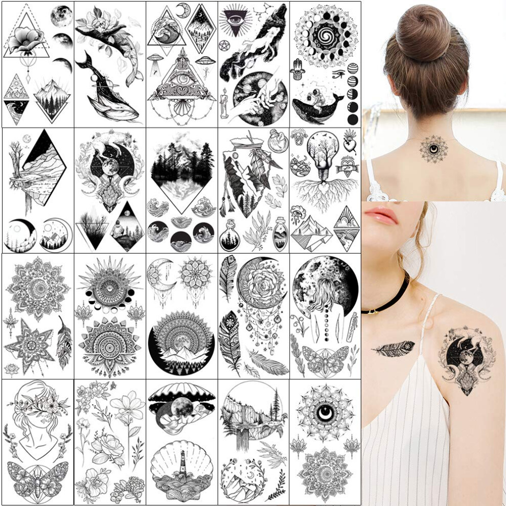 20 Sheets Black Tiny Temporary Tattoo, Hands Face Tattoos Sticker for Men Women, Forest Mountain Designs Body Art on Arm Neck Shoulder Clavicle Waterp