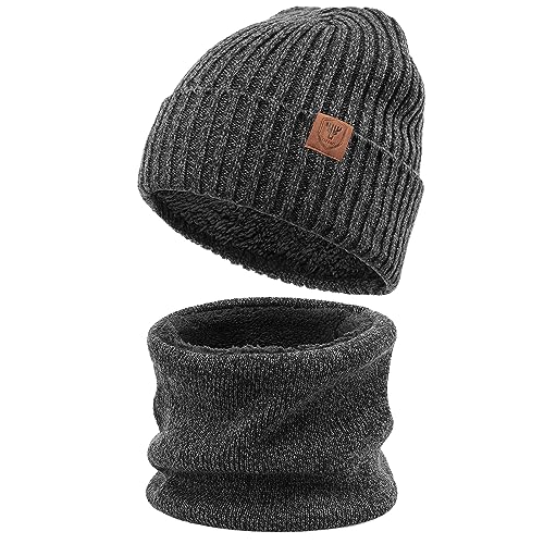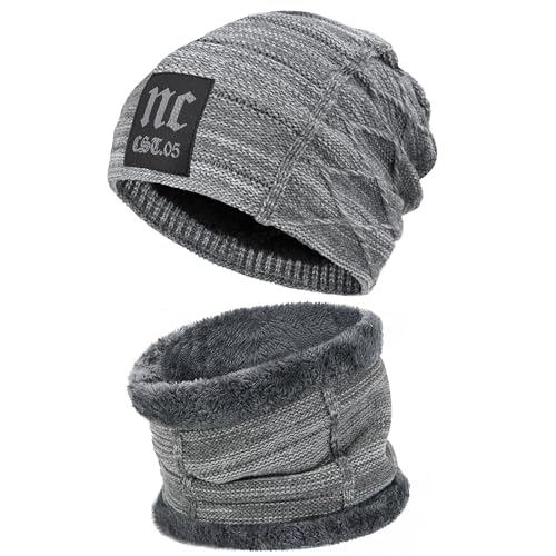 OZERO Winter Beanie Hat Scarf Set: Warm Thermal Thickened Fleece Lining Knitted Hat Neck Warmer for Men Women Hiking Runing Cycling Snow Day - Grey