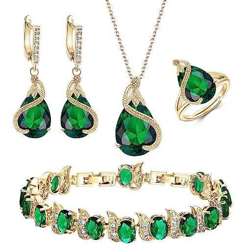 Ever Faith Women's Jewelry Set Green Jewellery Sparkly Cubic Zirconia Birthstone Teardrop Necklace Earring Bracelet Ring Sets for Women Birthday Gifts 4 PCS Gold-Tone