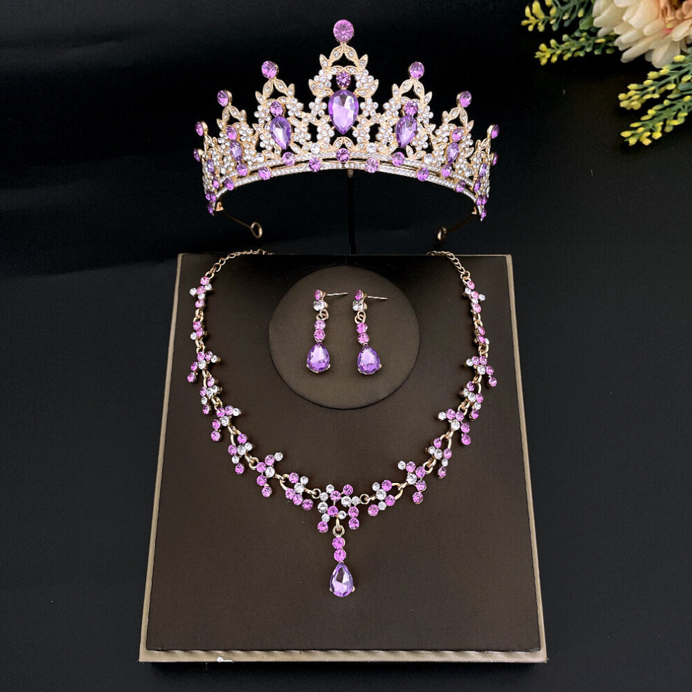 Purple Pink Crystal Flower Necklace Earring Jewelry Sets Princess Bridal Bride Tiara Crown Jewelry