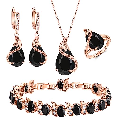 Ever Faith Women's Jewelry Set Black Jewellery Sparkly Cubic Zirconia Birthstone Teardrop Necklace Earring Bracelet Ring Sets for Women Birthday Gifts 4 PCS Rose Gold-Tone