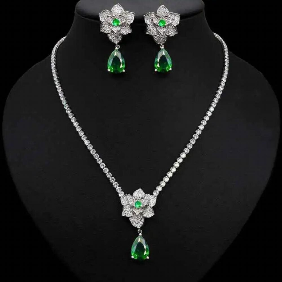 Zirconia Double Heart Shaped Plated Jewel Set, Necklace And Earring Jewelry Sets For Elegant, Set Women(Green)