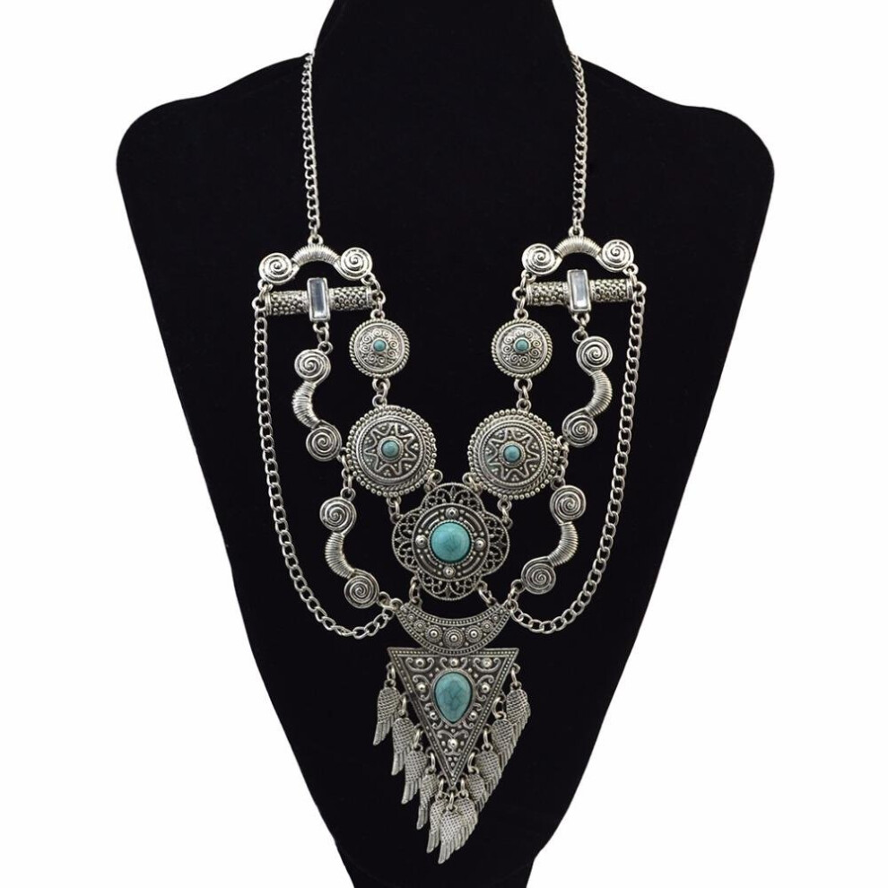Idealway Boho Leaf Pendant Maxi Necklace Silver Gold Color Women Blue Red Stone Statement Necklace Earring Sets Gypsy Jewelry