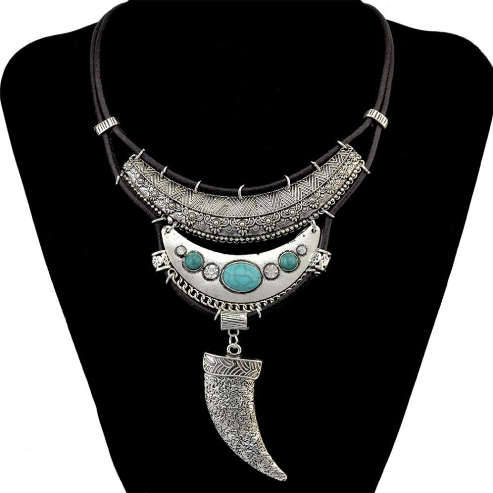 Idealway Vintage Ethnic Tribal Pendant Necklace Earring Sets Moon Shape Stone Rope Chain Choker Bib Necklace Women Boho Jewelry
