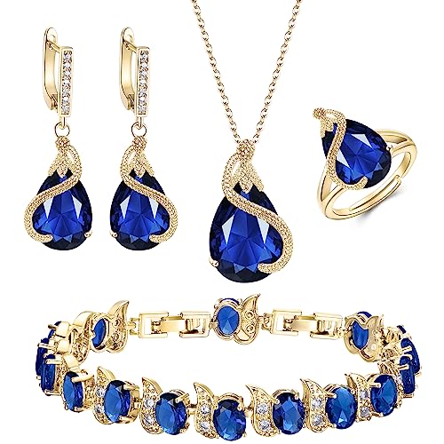 Ever Faith Women's Jewelry Set Blue Jewellery Sparkly Cubic Zirconia Birthstone Teardrop Necklace Earring Bracelet Ring Sets for Women Birthday Gifts 4 PCS Gold-Tone