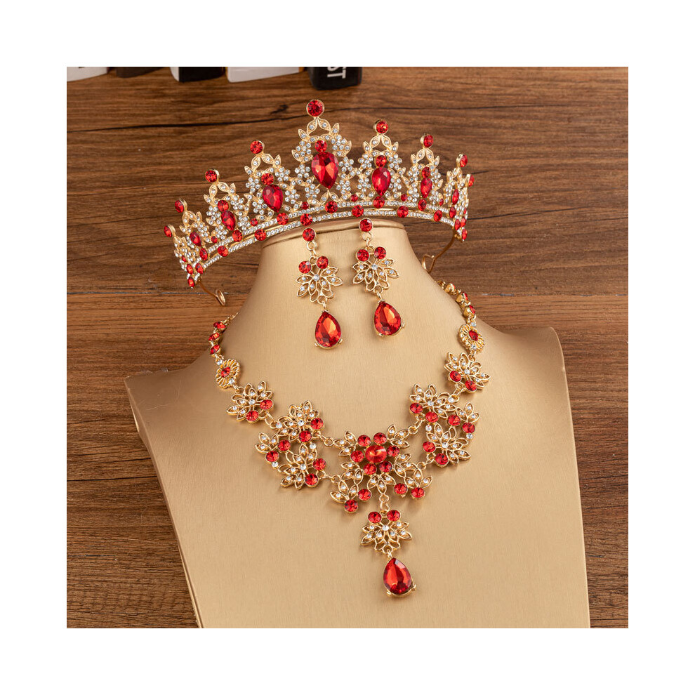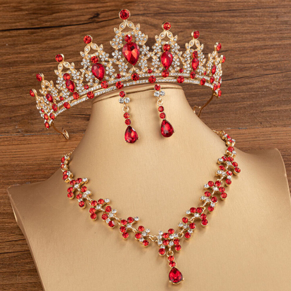 Red Green Crystal Necklace Earring Jewelry Sets Queen Bridal Bride Water Drop Tiara Crown Jewelry