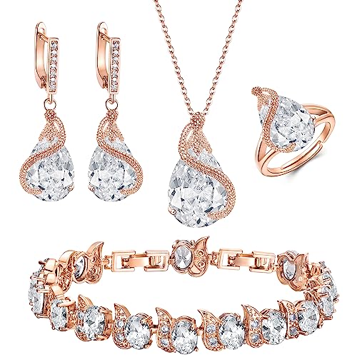 Ever Faith Women's Jewelry Set Bridal Jewellery Sparkly Cubic Zirconia Teardrop Necklace Earring Bracelet Ring Sets for Women Birthday Gifts 4 PCS Clear Rose Gold-Tone