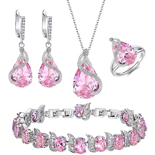 Ever Faith Women's Jewelry Set Pink Jewellery Sparkly Cubic Zirconia Teardrop Necklace Earring Bracelet Ring Sets for Women Birthday Gifts 4 PCS Silver-Tone