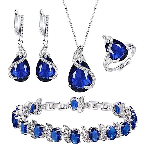 Ever Faith Women's Jewelry Set Blue Jewellery Sparkly Cubic Zirconia Birthstone Teardrop Necklace Earring Bracelet Ring Sets for Women Birthday Gifts 4 PCS Silver-Tone
